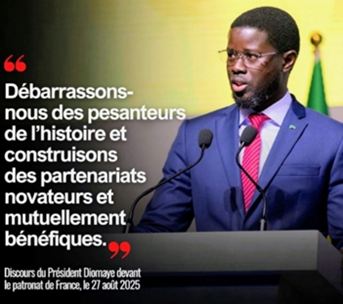 En août 2025, à Paris, devant le patronat français, malgré un climat anti-français à Dakar, le nouveau président a sollicité un transfert de compétences productives, soulignant la nécessité de partenariats économiques innovants axés sur la formation et le développement industriel, plutôt que de se contenter d'extraire des matières premières.